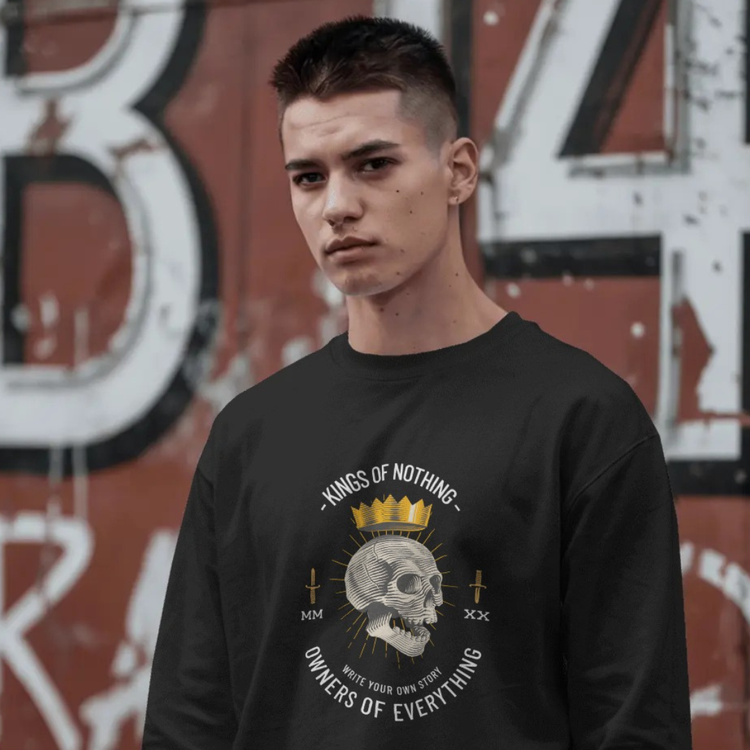 Step into your own legend with the "Kings of Nothing – Owners of Everything" sweatshirt, with a powerful message: "Write Your Own Story." The artwork symbolizes the idea that true royalty comes not from material possessions, but from owning your destiny and embracing fearless self-expression. This sweatshirt makes a striking statement for rebels, thinkers, and anyone forging their own path. Wear it as a reminder that the crown belongs to those who dare.