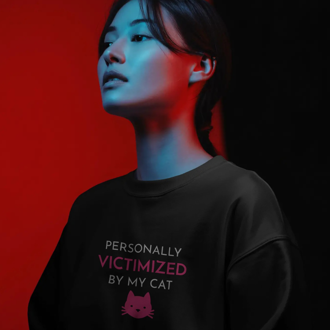 Spot-on for cat moms surviving daily feline chaos! πΌπ₯ Victim cat with wide eyes & dramatic pose "personally victimizes" you in bold, distressed textΒ "Personally Victimized by My Cat"Β β pure sassy truth across the chest! ππ₯β¨π