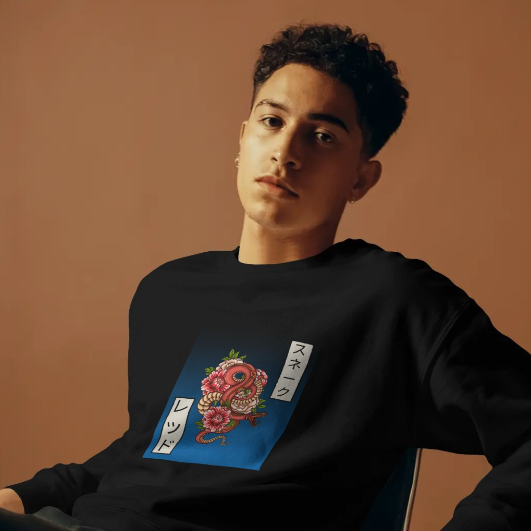 Unleash bold energy this winter with the "Red Serpent Bloom" sweatshirt. Featuring a striking intertwined red snake and lush peonies, this design is inspired by traditional Japanese tattoo art—symbolizing strength, transformation, and beauty. Japanese calligraphy accents add authentic flair, spelling out "Red Snake" for a unique East-meets-West style statement. Made for those who embrace both elegance and power, this cozy sweatshirt infuses your wardrobe with vibrant color and artistic edge. Perfect for standing out and staying warm all season long.