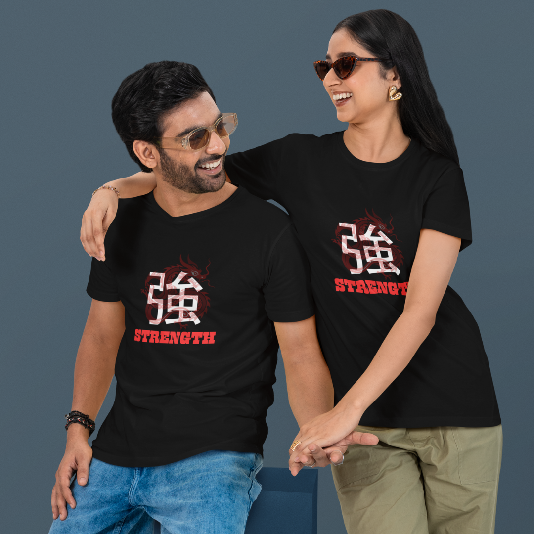 Channel the power within. This design pairs the Japanese symbol for strength (Tsuyosa) representing courage, perseverance, and unyielding spirit.